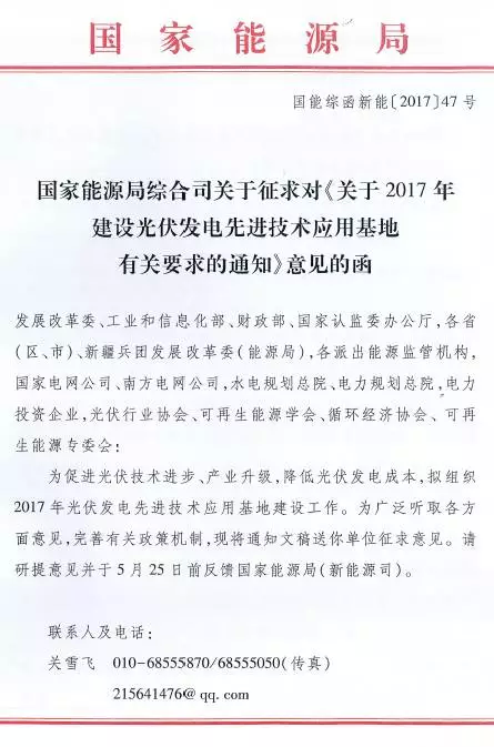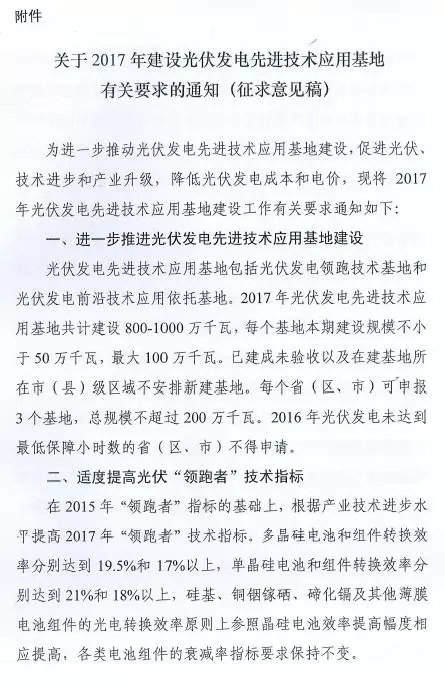 以下為《關(guān)于2017年建設(shè)光伏發(fā)電先進技術(shù)應(yīng)用基地有關(guān)要求的通知》(征求意見稿)