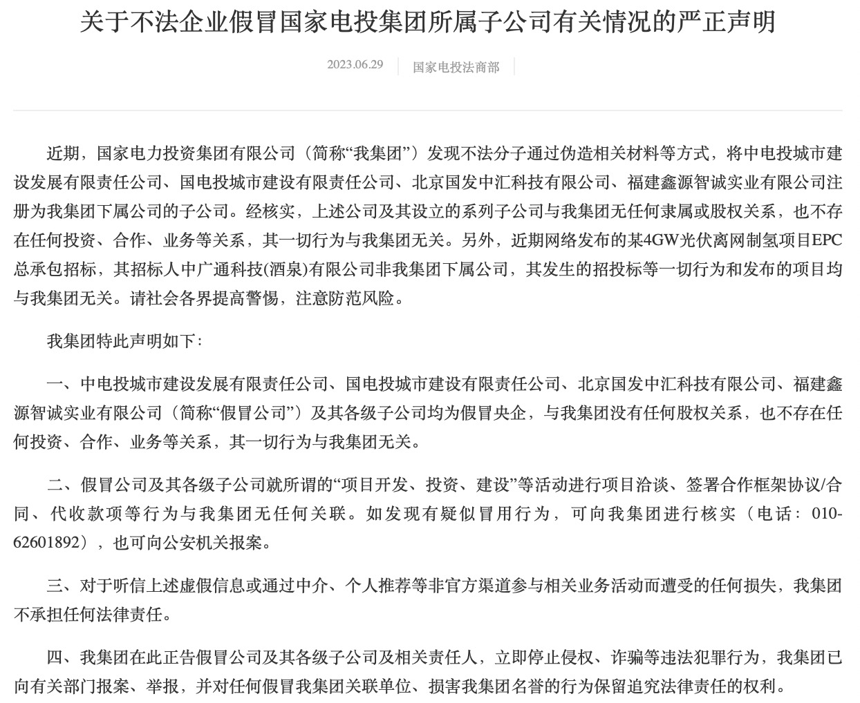 6月29日,國家電力投資集團(tuán)有限公司向澎湃新聞證實(shí),中廣通科技(酒泉)有限公司及與之相關(guān)的多家公司均為假冒國企。