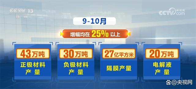 據了解,今年以來,我國鋰電池生產各環(huán)節(jié)均保持高位增長。9—10月,正極材料、負極材料、隔膜、電解液產量分別達到43萬噸、30萬噸、27億平方米、20萬噸,增幅均在25%以上。