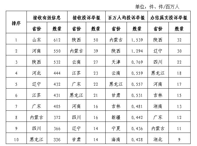 各省(自治區(qū)、直轄市)按照收到的有效信息數(shù)量排序,山東、河南、陜西、河北、遼寧、江蘇、廣東、內(nèi)蒙古、四川、黑龍江等列全國前10位;按照投訴舉報(bào)數(shù)量排序,陜西、內(nèi)蒙古、云南、江蘇、廣東、黑龍江、河南、四川、遼寧、甘肅等排在全國前10位。按照百萬人均投訴舉報(bào)數(shù)量排序,內(nèi)蒙古、陜西、天津、云南、黑龍江、甘肅、吉林、新疆、寧夏、海南等排在全國前10位。按照辦結(jié)屬實(shí)投訴舉報(bào)數(shù)量排序,陜西、遼寧、四川、黑龍江、河南、吉林、湖南、廣東、內(nèi)蒙古、湖北等排在全國前10位。(2020年10月有效信息及投訴舉報(bào)排名前10位情況見表三)