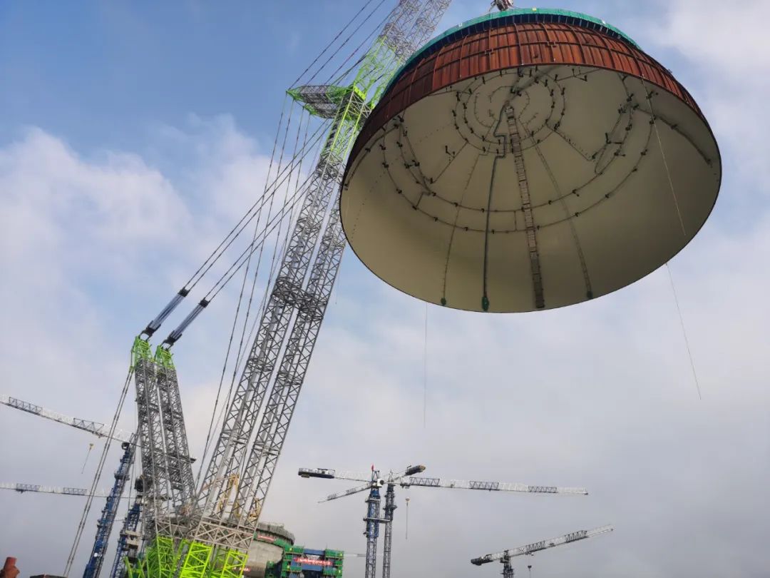內(nèi)穹頂?shù)跹b是華龍一號核電工程建設(shè)的重要里程碑。穹頂位于核島頂部,主要功能是保證反應(yīng)堆廠房完整性和密封性,對放射性包容起關(guān)鍵性作用。吊裝當天,隨著總指揮一聲令下,內(nèi)穹頂被緩緩吊離地面,經(jīng)過起鉤、變幅、提升、帶載行走、大臂逆時針回轉(zhuǎn)等一系列高精度動作,精準直達漳州核電2號機組反應(yīng)堆廠房上方,隨后緩慢下降,經(jīng)調(diào)整無誤后,平穩(wěn)落鉤就位在安全殼鋼襯里上。