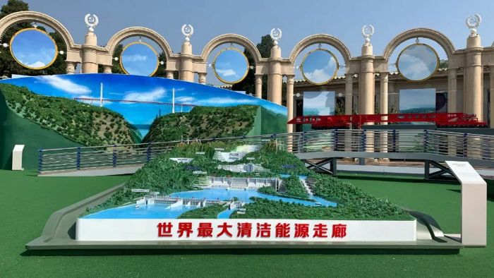 沙盤模型展示了長江干流烏東德、白鶴灘、溪洛渡、向家壩、三峽、葛洲壩6座梯級水電站樞紐建筑物及配套設(shè)施,逼真再現(xiàn)了由這6座梯級電站構(gòu)成的世界最大清潔能源走廊的恢弘氣勢與格局,向觀眾呈現(xiàn)了新中國水電事業(yè)從自立更生、創(chuàng)新發(fā)展到領(lǐng)跑世界的奮斗歷程,并融入新能源和長江大保護(hù)等元素,展示了三峽集團(tuán)奮力實(shí)施清潔能源和長江生態(tài)環(huán)保“兩翼齊飛”發(fā)展愿景。