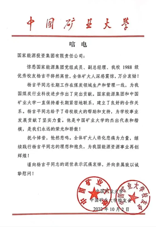 國(guó)家能源集團(tuán)黨組成員、副總經(jīng)理?xiàng)罴酵荆蛲话l(fā)疾病搶救無效,于2022年10月2日9時(shí)33分在北京不幸逝世,享年53歲。他的遺體送別會(huì),于10月4日上午11:30在北京八寶山殯儀館舉行。