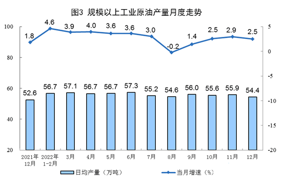 原油加工增速有所加快。12月份,加工原油5988萬噸,同比增長(zhǎng)2.5%,增速比上月加快2.2個(gè)百分點(diǎn),日均加工193.2萬噸。2022年,加工原油67590萬噸,同比下降3.4%。