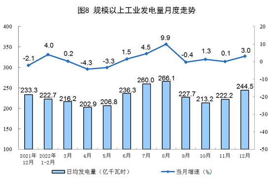 電力生產(chǎn)增速加快。12月份,發(fā)電7579億千瓦時(shí),同比增長(zhǎng)3.0%,增速比上月加快2.9個(gè)百分點(diǎn),日均發(fā)電244.5億千瓦時(shí)。2022年,發(fā)電8.4萬億千瓦時(shí),同比增長(zhǎng)2.2%。