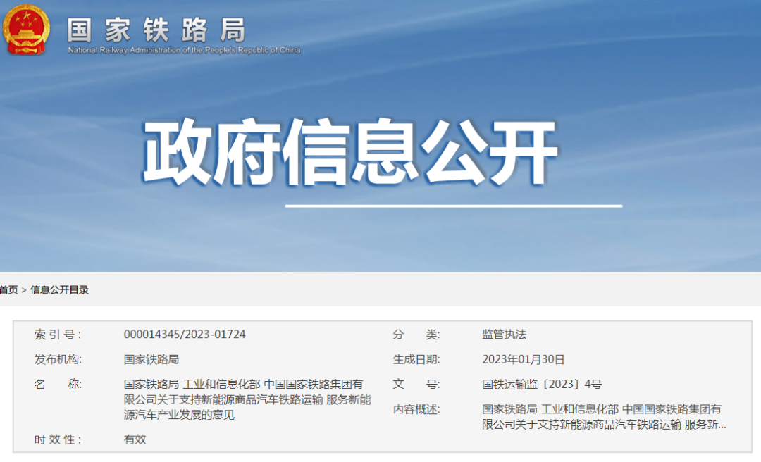 國(guó)家鐵路局 工業(yè)和信息化部 中國(guó)國(guó)家鐵路集團(tuán)有限公司關(guān)于支持新能源商品汽車鐵路運(yùn)輸 服務(wù)新能源汽車產(chǎn)業(yè)發(fā)展的意見(jiàn)