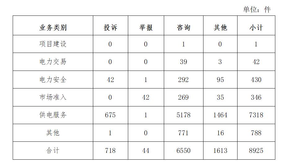 電力行業(yè)投訴舉報數(shù)量為762件,占全部投訴舉報數(shù)量的97.57%。反映的主要問題有:一是黑龍江、陜西等地個別供電企業(yè)搶修力量不足或者配置不合理,導(dǎo)致故障停電后未能及時恢復(fù)供電;二是四川、陜西等地受供電設(shè)備故障老化、用電負荷較高等因素影響,出現(xiàn)故障停電、低電壓等問題;三是內(nèi)蒙古、江蘇等地個別供電企業(yè)未嚴格落實用電“三零”服務(wù)有關(guān)要求,群眾用電報裝受阻問題較為突出。