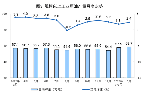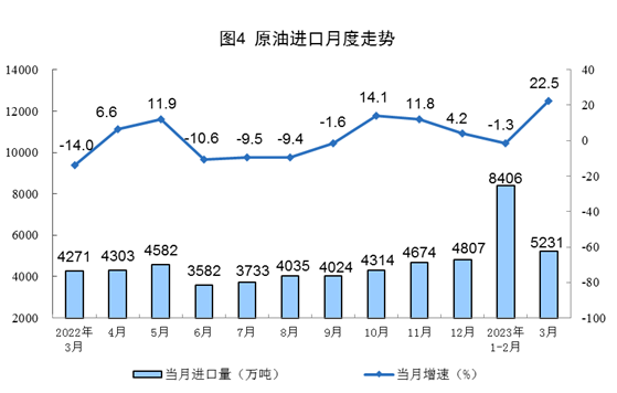 原油生產(chǎn)略有加快,進(jìn)口由降轉(zhuǎn)增。3月份,生產(chǎn)原油1818萬噸,同比增長(zhǎng)2.4%,增速比1—2月份加快0.6個(gè)百分點(diǎn),日均產(chǎn)量58.7萬噸。進(jìn)口原油5231萬噸,同比增長(zhǎng)22.5%,1—2月份為下降1.3%。