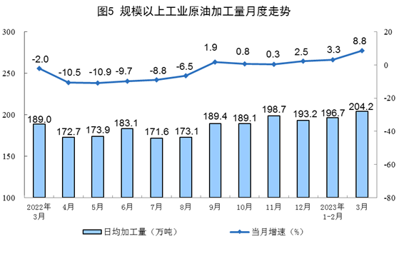 原油加工增速加快。3月份,加工原油6329萬噸,同比增長(zhǎng)8.8%,增速比1—2月份加快5.5個(gè)百分點(diǎn),日均加工原油204.2萬噸。1—3月份,加工原油17926萬噸,同比增長(zhǎng)5.2%。