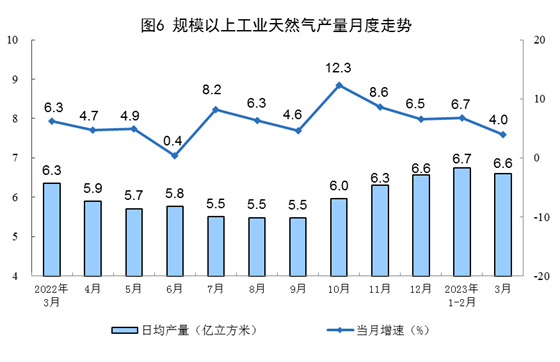 天然氣生產(chǎn)有所放緩,進(jìn)口由降轉(zhuǎn)增。3月份,生產(chǎn)天然氣205億立方米,同比增長(zhǎng)4.0%,增速比1—2月份放緩2.7個(gè)百分點(diǎn),日均產(chǎn)量6.6億立方米。進(jìn)口天然氣887萬噸,同比增長(zhǎng)11.1%,1—2月份為下降9.4%。