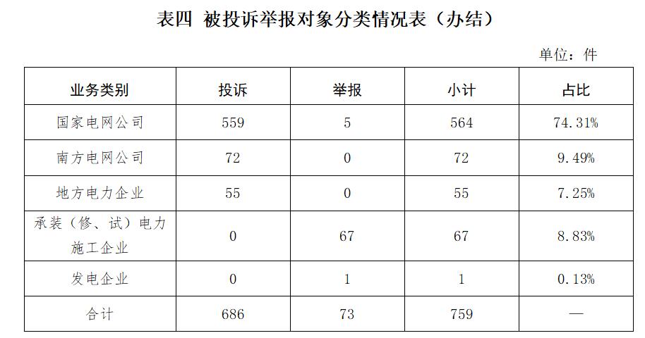 從被投訴舉報(bào)對(duì)象看,供電企業(yè)691件、占比91.04%,其中國(guó)家電網(wǎng)公司564件、占比74.31%,南方電網(wǎng)公司72件、占比9.49%,地方電力企業(yè)55件、占比7.25%;承裝(修、試)電力施工企業(yè)投訴舉報(bào)67件、占比8.83%;新能源企業(yè)投訴舉報(bào)1件、占比0.13%。(詳見(jiàn)表四)