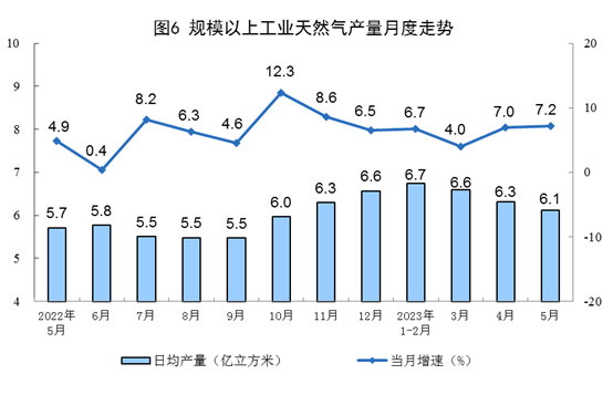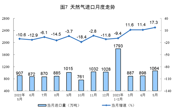 天然氣生產(chǎn)穩(wěn)步增長,進(jìn)口增速加快。5月份,生產(chǎn)天然氣190億立方米,同比增長7.2%,增速比4月份加快0.2個百分點(diǎn),日均產(chǎn)量6.1億立方米。進(jìn)口天然氣1064萬噸,同比增長17.3%,增速比4月份加快5.9個百分點(diǎn)。
