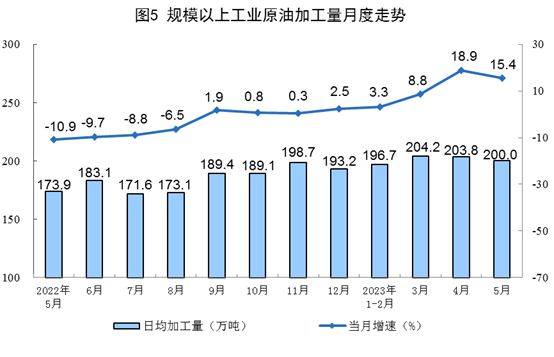 原油加工保持較快增長,增速有所回落。5月份,加工原油6200萬噸,同比增長15.4%,增速比4月份回落3.5個百分點(diǎn),日均加工原油200.0萬噸。1—5月份,加工原油30263萬噸,同比增長9.8%。