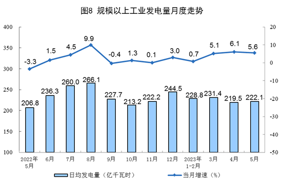 電力生產(chǎn)增速略有回落。5月份,發(fā)電6886億千瓦時,同比增長5.6%,增速比4月份回落0.5個百分點(diǎn),日均發(fā)電222.1億千瓦時。1—5月份,發(fā)電34216億千瓦時,同比增長3.9%。
