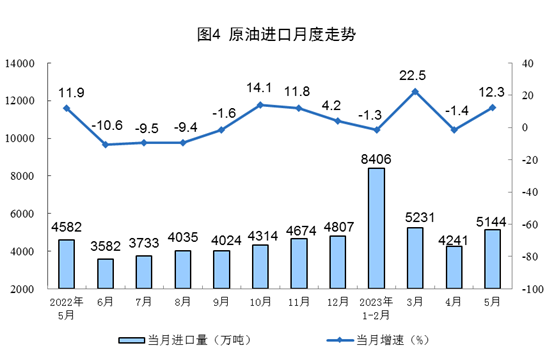 原油生產(chǎn)有所加快,進(jìn)口由降轉(zhuǎn)增。5月份,生產(chǎn)原油1807萬噸,同比增長2.7%,增速比4月份加快1.3個百分點(diǎn),日均產(chǎn)量58.3萬噸。進(jìn)口原油5144萬噸,同比增長12.3%,4月份為下降1.4%。