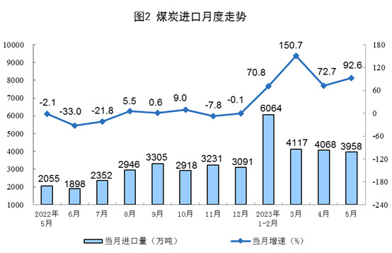 原煤生產(chǎn)保持穩(wěn)定,進(jìn)口持續(xù)高位增長。5月份,生產(chǎn)原煤3.9億噸,同比增長4.2%,增速比4月份放緩0.3個百分點(diǎn),日均產(chǎn)量1243萬噸。進(jìn)口煤炭3958萬噸,同比增長92.6%,增速比4月份加快19.9個百分點(diǎn)。