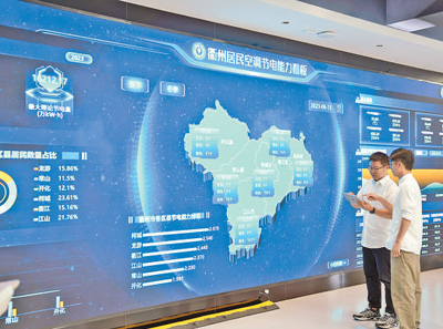 浙江省衢州市能源大數(shù)據(jù)中心,國(guó)網(wǎng)浙江衢州供電公司員工利用數(shù)字化平臺(tái)監(jiān)測(cè)全市居民空調(diào)節(jié)電情況。