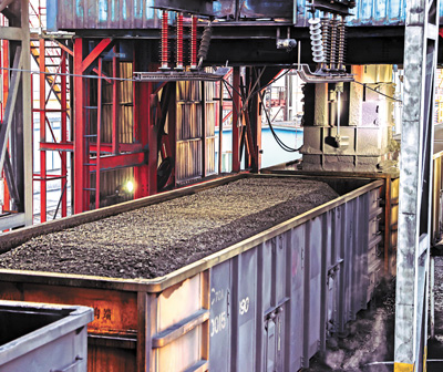 裝煤 陜西省榆林市 國(guó)家能源集團(tuán)神東煤炭洗選中心大柳塔環(huán)線裝車車間裝煤現(xiàn)場(chǎng)。