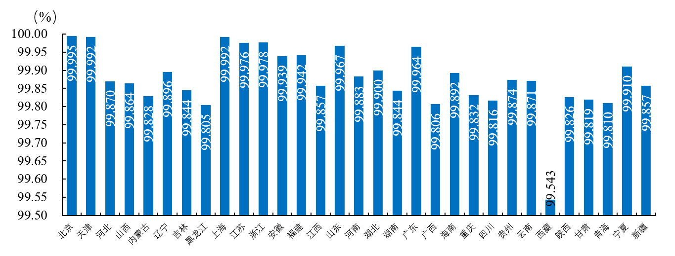 2022年,全國31個(gè)省級(jí)行政區(qū)中,北京、天津、上海、浙江、江蘇、廣東、山東的用戶平均供電可靠率高于99.95%,西藏的用戶平均供電可靠率低于99.80%。