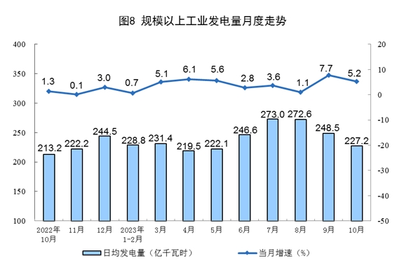 電力生產(chǎn)穩(wěn)步增長。10月份,發(fā)電量7044億千瓦時(shí),同比增長5.2%,增速比9月份放緩2.5個(gè)百分點(diǎn),日均發(fā)電227.2億千瓦時(shí)。1—10月份,發(fā)電量73330億千瓦時(shí),同比增長4.4%。