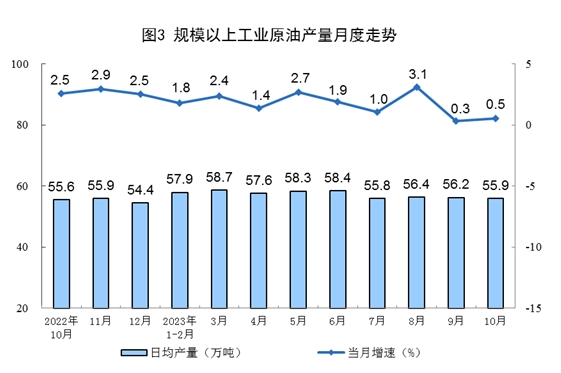 原油生產(chǎn)增速略有加快,進(jìn)口保持較快增長。10月份,生產(chǎn)原油1733萬噸,同比增長0.5%,增速比9月份加快0.2個(gè)百分點(diǎn),日均產(chǎn)量55.9萬噸。進(jìn)口原油4897萬噸,同比增長13.5%,增速比9月份放緩0.2個(gè)百分點(diǎn)。