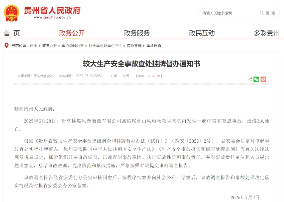 2025年6月28日,冊(cè)亨縣惠風(fēng)新能源有限公司弼佑尾外山風(fēng)電場(chǎng)項(xiàng)目基坑內(nèi)發(fā)生一起中毒和窒息事故,造成3人死亡。