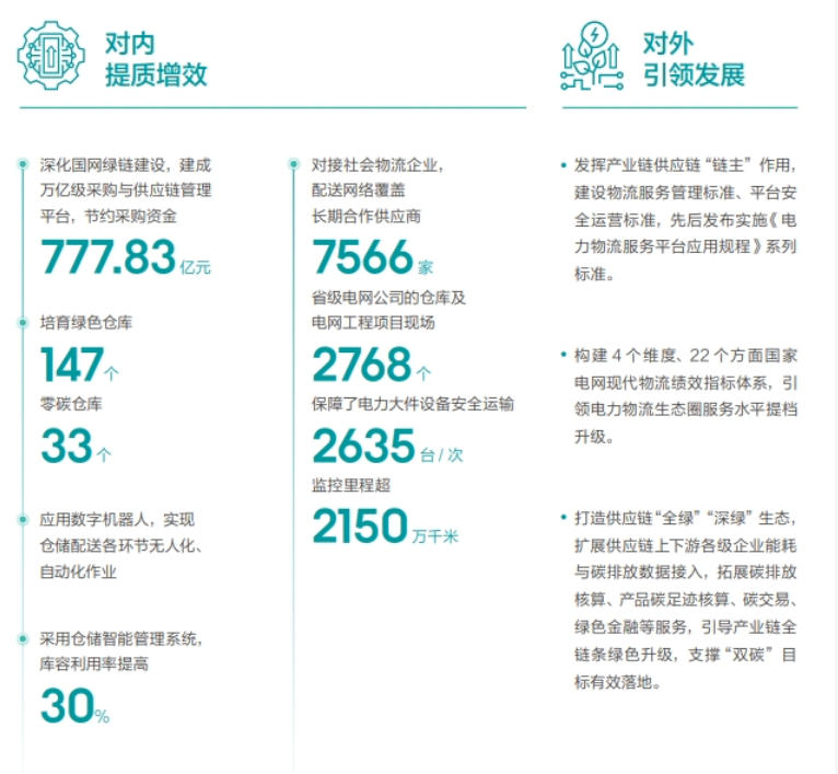 打造綠色數(shù)智供應(yīng)鏈,對內(nèi)深化國網(wǎng)綠鏈建設(shè),建成萬億級采購與供應(yīng)鏈管理平臺,節(jié)約采購資金777.83億元;對外構(gòu)建4個(gè)維度、22個(gè)方面國家電網(wǎng)現(xiàn)代物流績效指標(biāo)體系,引領(lǐng)電力物流生態(tài)圈服務(wù)水平提檔升級。