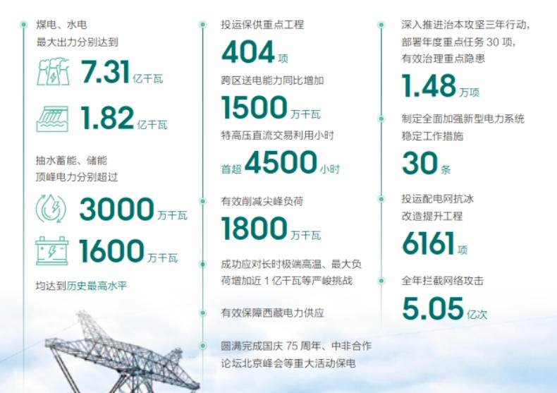投運(yùn)保供重點(diǎn)工程404項(xiàng)、配電網(wǎng)抗冰改造提升工程6161項(xiàng),攔截網(wǎng)絡(luò)攻擊5.05億次,成功應(yīng)對長時(shí)極端高溫、最大負(fù)荷增加近1億千瓦等嚴(yán)峻挑戰(zhàn),解決配電網(wǎng)抗災(zāi)脆弱性問題,消除縣域聯(lián)系薄弱等網(wǎng)架結(jié)構(gòu)短板。