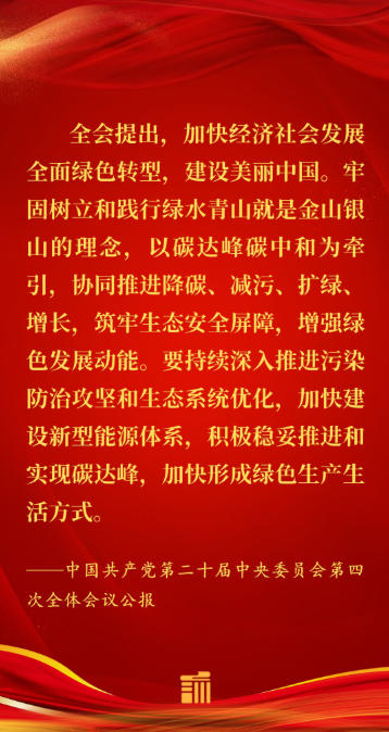 全會提出,加快經(jīng)濟(jì)社會發(fā)展全面綠色轉(zhuǎn)型,建設(shè)美麗中國。牢固樹立和踐行綠水青山就是金山銀山的理念,以碳達(dá)峰碳中和為牽引,協(xié)同推進(jìn)降碳、減污、擴(kuò)綠、增長,筑牢生態(tài)安全屏障,增強(qiáng)綠色發(fā)展動能。要持續(xù)深入推進(jìn)污染防治攻堅(jiān)和生態(tài)系統(tǒng)優(yōu)化,加快建設(shè)新型能源體系,積極穩(wěn)妥推進(jìn)和實(shí)現(xiàn)碳達(dá)峰,加快形成綠色生產(chǎn)生活方式。
