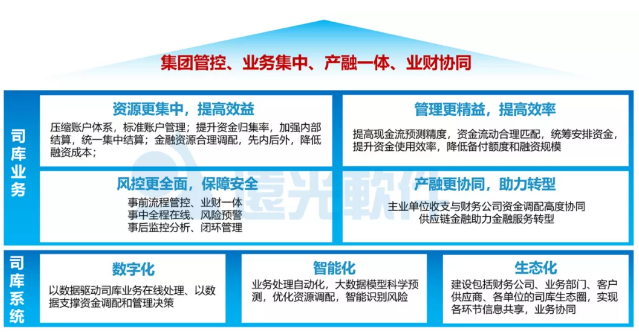 結合集團企業(yè)發(fā)展需求和業(yè)界實踐經(jīng)驗,司庫管理體系建設需滿足“資源更集中、管理更精益、風控更全面、產(chǎn)融更協(xié)同”四個標準,以數(shù)字化、智能化的司庫管理信息系統(tǒng)為支撐,以“集團管控、業(yè)務集中、產(chǎn)融一體、業(yè)務協(xié)同”為管理目標。