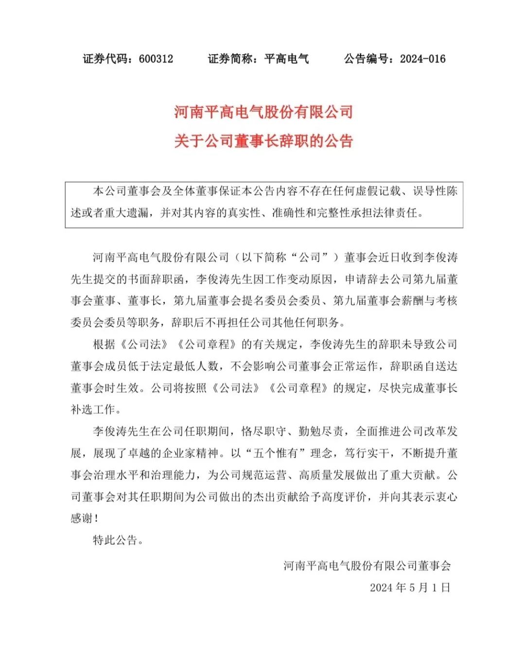5月1日,平高電氣發(fā)布公告稱,公司董事會近日收到李俊濤先生提交的書面辭職函,李俊濤先生因工作變動原因,申請辭去公司第九屆董事會董事、董事長,第九屆董事會提名委員會委員、第九屆董事會薪酬與考核委員會委員等職務,辭職后不再擔任公司其他任何職務。