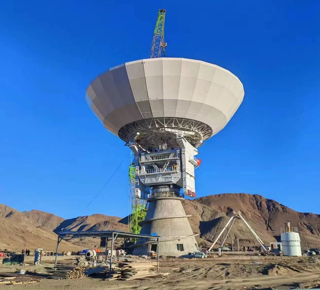 近日,由中國電科與中國科學(xué)院上海天文臺聯(lián)合研制的日喀則40米射電望遠(yuǎn)鏡,在西藏自治區(qū)日喀則市順利完成天線系統(tǒng)主反射體的吊裝,標(biāo)志著天線機(jī)械架設(shè)初步完成,為后續(xù)望遠(yuǎn)鏡電氣調(diào)試等聯(lián)調(diào)奠定堅實基礎(chǔ)。