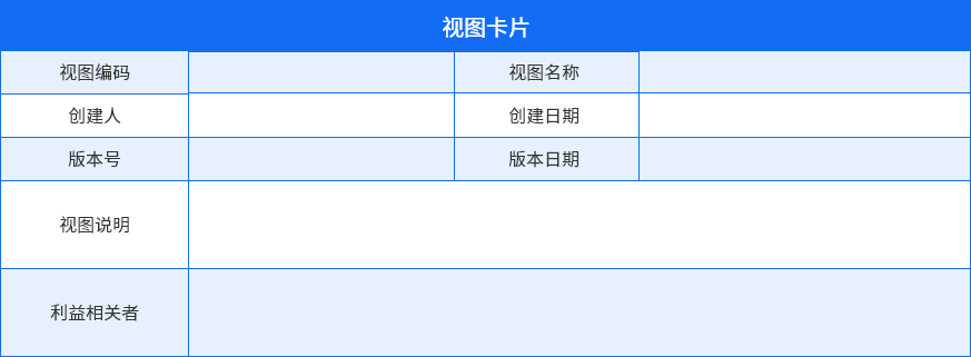 視圖卡片是關(guān)于視圖元信息的描述,通過視圖卡片可以了解視圖編碼、名稱、版本號(hào)、創(chuàng)建人、視圖描述和視圖的利益相關(guān)者。