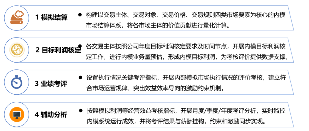 三、考核評價(jià)差異化、多樣化、智能化內(nèi)模市場考評體系以利潤為核心,通過考核評價(jià)指標(biāo)庫支撐成效考評。內(nèi)模市場考評體系以利潤為核心,通過考核評價(jià)指標(biāo)庫支撐成效考評?;趦?nèi)模市場交易數(shù)據(jù),對各交易主體進(jìn)行價(jià)值貢獻(xiàn)考評,考評結(jié)果與單位工資總額、企業(yè)負(fù)責(zé)人薪酬掛鉤,進(jìn)而實(shí)現(xiàn)約束與激勵(lì)并重,推動(dòng)市場管理取得實(shí)效。