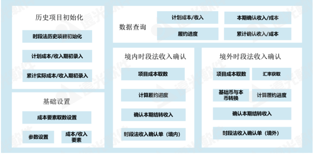 時段法收入核算系統(tǒng)包括“歷史項目初始化”、“基礎設置”、“境內時段法收入確認”、“境外時段法收入確認”和“數據查詢”五個模塊,詳細見以下圖所示。