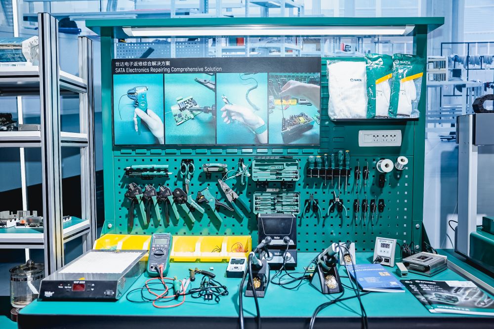 3) SATA世達(dá)電子綜合返修方案,搭配錫絲手工焊臺,微型夾持鑷子,各規(guī)格剝線壓接鉗,專用電子微型螺絲刀,高精度電表等,可應(yīng)對各種產(chǎn)品返修檢測需求。