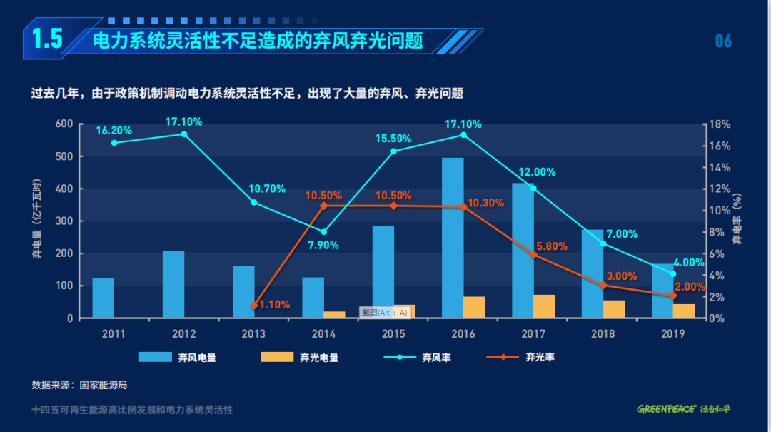 目前,中國以煤電為主的電力系統(tǒng)靈活性嚴重不足,電力系統(tǒng)的僵化導致了棄風、棄光問題的出現(xiàn)。2011-2019年,中國的棄風和棄光率一度高達17.1%和10.5%,造成了大量發(fā)電資源的浪費。2016-2018年間,中國棄風和棄光電量共計1389億千瓦時 ,相當于約3000萬千瓦煤電廠的發(fā)電量。
