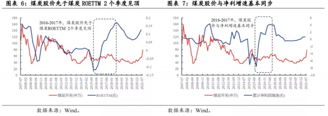 供給壓縮主導(dǎo)的煤炭價(jià)格上漲,股價(jià)與基本面相關(guān)性更高,累計(jì)凈利增速可能是更重要的觀測變量。2016-2017年煤炭股價(jià)的上漲與基本面基本同步,從時(shí)間維度來看,那輪行情中,煤炭股價(jià)提前于煤炭股ROE 2個(gè)季度見頂,2017年三季度至2018年三季度,煤炭股ROE持續(xù)上漲,但煤炭股價(jià)相對全A收益率卻為-6.14%。與之形成對比的是,2017年三季度煤炭股凈利潤增速與煤炭股價(jià)同步見頂,隨后的一年內(nèi)雖保持在70%以上的高位,但煤炭股價(jià)依舊下滑。