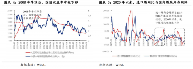 2020年以來,進(jìn)口煤數(shù)量與國內(nèi)煤炭庫存同降,煤炭價(jià)格上漲持續(xù)時(shí)間可能比第二輪更長。2015-2016年,雖然國內(nèi)煤炭庫存同比處于低位,但進(jìn)口煤數(shù)量同比持續(xù)攀升,可能部分彌補(bǔ)了國內(nèi)煤炭的數(shù)量。而2020年以來,進(jìn)口煤炭數(shù)量與國內(nèi)煤炭庫存同步下滑,并且下滑的幅度要高于2015-2016年,疊加碳中和的長期政策,國內(nèi)煤炭價(jià)格上漲的持續(xù)時(shí)間可能比第二輪更長。