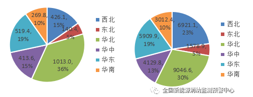 四季度各區(qū)域新增(左)、累計(jì)(右)并網(wǎng)光伏發(fā)電裝機(jī)(萬千瓦)