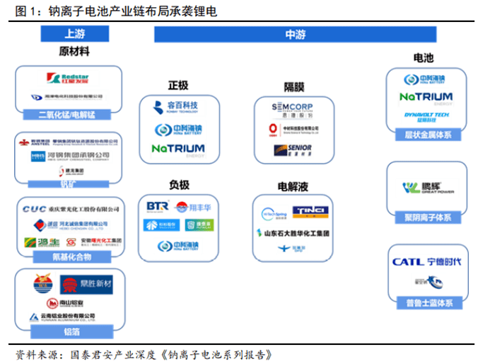 鈉電產(chǎn)業(yè)鏈布局承襲鋰電,利于產(chǎn)業(yè)化快速導(dǎo)入。我國(guó)鈉離子電池產(chǎn)業(yè)鏈還處于初級(jí)階段,產(chǎn)業(yè)布局尚不成熟。鈉離子電池產(chǎn)業(yè)鏈結(jié)構(gòu)與鋰電類似,包括上游資源企業(yè)、中游電池材料及電芯企業(yè)。