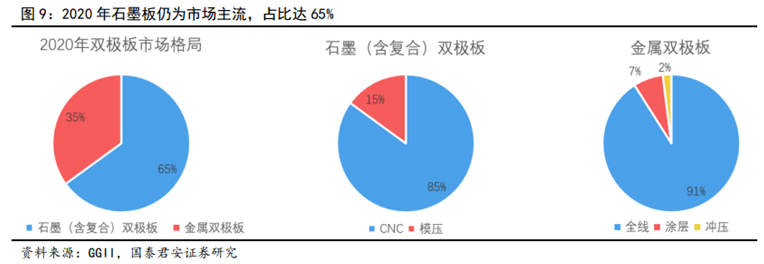 市場(chǎng)格局:仍以石墨板為主,金屬板或后來(lái)居上。氫燃料電池方面,2020年我國(guó)氫燃料電池雙極板市場(chǎng)規(guī)模達(dá)3.1億元,石墨板(包含碳塑復(fù)合板)和金屬板的市場(chǎng)占比分別為65%和35%,2021年石墨雙極板與金屬雙極板趨于平分秋色。GGII數(shù)據(jù)顯示,2021年H1金屬雙極板出貨量在雙極板總出貨量的占比已達(dá)45.0%(2020年同期為36.0%)。釩液流電池方面,基本不考慮金屬板,即使是涂層處理后的金屬板,在酸性液體環(huán)境中也難以長(zhǎng)期穩(wěn)定工作。石墨雙極板(機(jī)加工)不被看好,因?yàn)槠錂C(jī)加工過(guò)程復(fù)雜且成本高。釩液流電池主要采用碳塑復(fù)合板,因?yàn)槠錈崴芑蚰汗に囅鄬?duì)機(jī)加工簡(jiǎn)單,但是混合高分子樹(shù)脂所帶來(lái)的電阻率增加仍是需要解決的問(wèn)題。