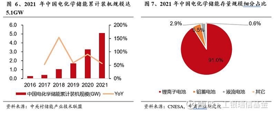 我國(guó)電化學(xué)儲(chǔ)能裝機(jī)規(guī)模持續(xù)高速增長(zhǎng),其中鋰電池儲(chǔ)能規(guī)模占比超九成。2021年,中國(guó)電化學(xué)儲(chǔ)能累計(jì)裝機(jī)規(guī)模5.1GW,同比增長(zhǎng)56.5%,2016-2021年CAGR高達(dá)79.3%。其中,鋰離子電池儲(chǔ)能技術(shù)裝機(jī)規(guī)模4.7GW,裝機(jī)規(guī)模占比91.0%;鉛蓄電池儲(chǔ)能裝機(jī)規(guī)模0.3GW,占比5.5%;液流電池儲(chǔ)能技術(shù)裝機(jī)規(guī)模0.1GW,占比2.9%。