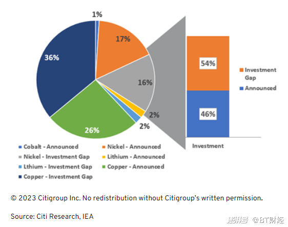 根據(jù)國際能源署(IEA)的數(shù)據(jù),關(guān)鍵礦產(chǎn)所需的投資在3600億至4500億美元之間??紤]到已宣布的項目,目前的投資缺口為54%,即1940億美元至2430億美元。目前,投資缺口最大的礦產(chǎn)是銅,占36%,其次是鎳,占16%。