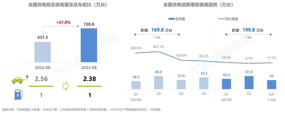 截止2023年8月,全國充電基礎(chǔ)設(shè)施累計數(shù)量為720萬臺,同比增加67.0%,車樁比為2.38,較去年同期與今年二季度的2.43均繼續(xù)下降。從充電設(shè)施建設(shè)上看,今年1-8月,充電樁新增安裝近200萬臺,新增安裝數(shù)量超越去年同期,7-8月充電樁安裝56萬臺,與今年二季度相比增速再次抬頭。