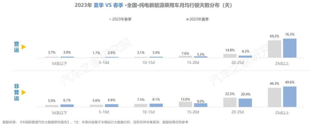 與去年同期相比,純電車輛在行駛里程有所增加,在出行天數(shù)與行駛時長方面,同去年夏季相比大體持平。而從不同車輛性質(zhì)對比上看,營運車輛的使用強度遠超非營運車輛,兩者在行駛里程方面相差超6倍,在日均時長則亦有近5倍的差距。