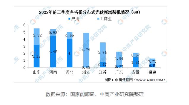 從各省份分布式光伏新增裝機情況來看,山東、河南、河北分布式光伏新增裝機較大。其中,山東戶用分布式光伏新增裝機3.19GW,工商業(yè)分布式光伏新增裝機2.32GW。上述地區(qū)主要是有電或不缺電地區(qū),因此基本為并網型分布式新能源發(fā)電系統(tǒng),據不完全統(tǒng)計,分布式并網型光伏市場規(guī)模約占分布式95%左右,其主要企業(yè)是浙江正泰安能電力系統(tǒng)有限公司、江蘇昱德新能源科技有限公司、深圳禾望電氣股份有限公司等并網新能源發(fā)電系統(tǒng)制造企業(yè)。整個離網型光伏/風光互補供電系統(tǒng),因為它的分布主要在邊遠地區(qū)、無電地區(qū)、缺電地區(qū)和電力不穩(wěn)定地區(qū),市場規(guī)模5%左右,約230萬千瓦左右。主要是南京歐陸電氣股份有限公司、上海致遠綠色能源股份有限公司、江蘇乃爾風電技術開發(fā)有限公司等為主的以離網新能源發(fā)電系統(tǒng)制造企業(yè)。