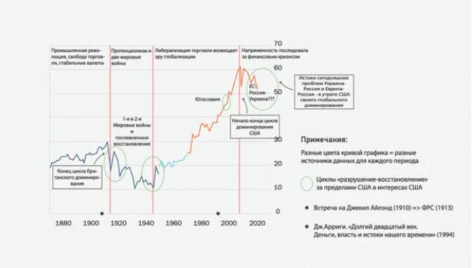 20世紀(jì)美國的兩次崛起可視為其積累周期、“漫長世紀(jì)”的基礎(chǔ)。這兩次崛起基于兩次世界大戰(zhàn)及其戰(zhàn)后恢復(fù)期,這里值得注意的是,兩次大戰(zhàn)均發(fā)生于歐洲和亞洲,不在美國的領(lǐng)土之上。很大程度上,美國為這兩次在其領(lǐng)土之外進行的戰(zhàn)爭和戰(zhàn)后重建提供了物資和技術(shù)(在擴展自己產(chǎn)量的基礎(chǔ)上)。另一方面,在美聯(lián)儲的運作下世界經(jīng)濟美元化的程度不斷加深??梢哉f,美國“漫長世紀(jì)”基于其疆域以外的世界經(jīng)歷“破壞—重建”,循環(huán)往復(fù)。