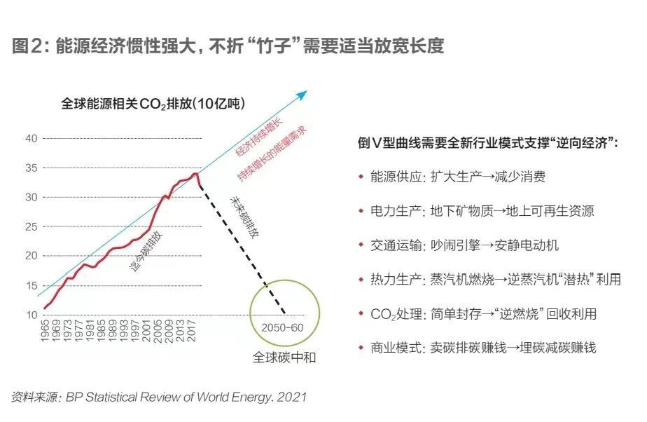 這個倒V型曲線需要全新的商業(yè)模式來支持逆向經濟,即所有的能源供應、電力生產等都要反過來,要從賣碳排碳賺錢的商業(yè)模式變成埋碳減碳賺錢的商業(yè)模式。