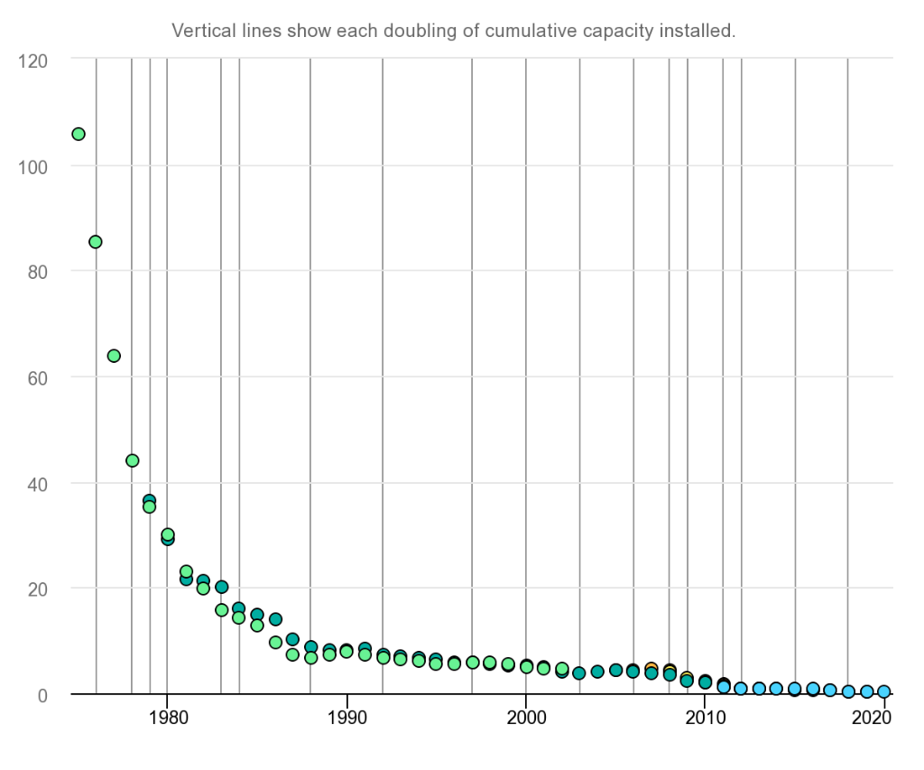 1975年,光伏的裝機成本高達(dá)105.7美元(2015年幣值,以下均同)/W,1990年,全球光伏發(fā)電量僅有91GWh。